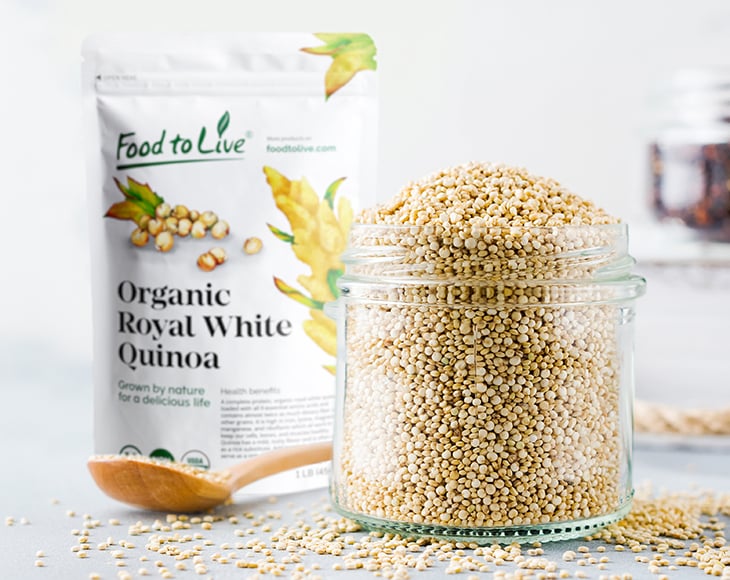 White Quinoa is a type of quinoa, which is an ancient pseudo-grain that originated in the Andean region of South America. It is a small, round, and ivory-colored grain with a slightly nutty flavor and a fluffy, creamy texture when cooked. White quinoa is the most common variety of quinoa and is widely popular in our superfoods store. Food to Live Organic White Quinoa is referred to as Royal; this is because it is grown at higher elevations in Bolivia. This variety of Quinoa of higher quality and nutritional value in comparison to other types. Moreover, Royal Quinoa is cultivated using traditional farming methods and is a sustainable and ethical choice. Note that despite being classed as a whole grain, quinoa isn’t a grain. It’s a seed that falls into the category of pseudo-grains. Due to this, it can be used as an alternative to grains in many meal plans.